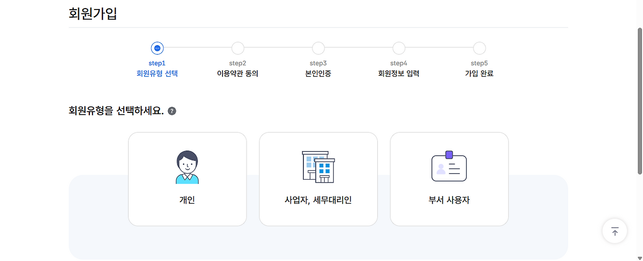 - 회원유형 선택 (개인, 개인사업자, 법인)